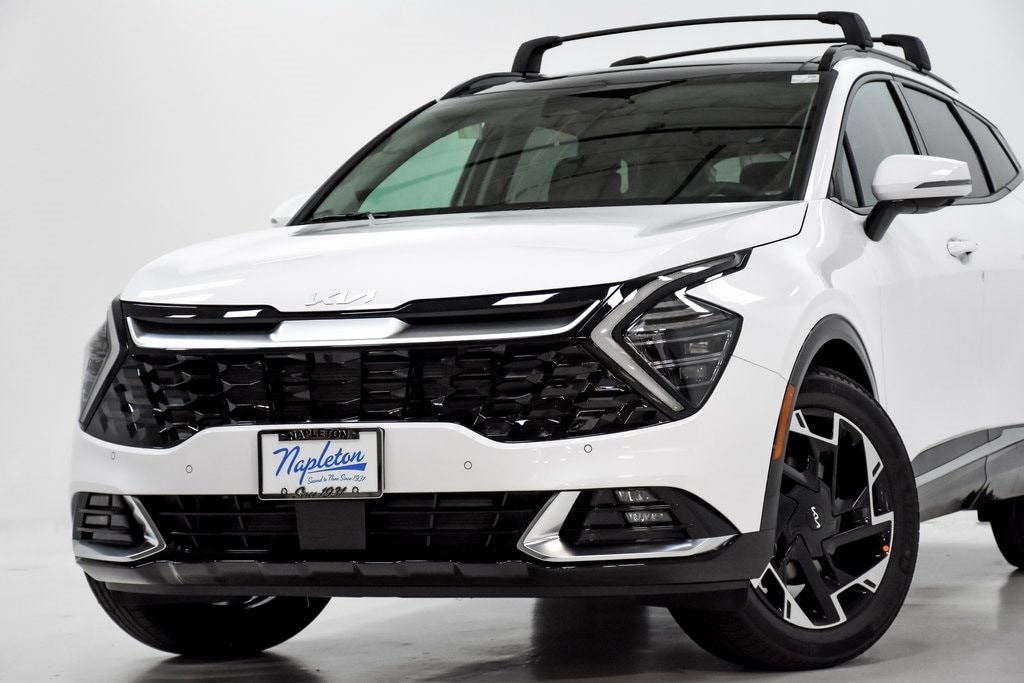 This Sportage is well equipped with AWD, 4-Wheel Disc Brakes, 8 Speakers, ABS brakes, Air Conditioning, Alloy wheels, AM/FM radio: SiriusXM, Apple CarPlay & Android Auto, Auto High-beam Headlights, Automatic temperature control, Axle Ratio: 3.648, Brake assist, Bumpers: body-color, Carpeted Floor Mats, Compass, Delay-off headlights, Driver door bin, Driver vanity mirror, Dual front impact airbags, Dual front side impact airbags, Electronic Stability Control, Emergency communication system, Four wheel independent suspension, Front anti-roll bar, Front Bucket Seats, Front Center Armrest, Front dual zone A/C, Front fog lights, Front reading lights, Fully automatic headlights, harman/kardon® Speakers, Heated & Ventilated Front Bucket Seats, Heated door mirrors, Heated front seats, Heated steering wheel, Illuminated entry, Leather Shift Knob, Leather steering wheel, Low tire pressure warning, Memory seat, Navigation System, Occupant sensing airbag, Outside temperature display, Overhead airbag, Overhead console, Panic alarm, Passenger door bin, Passenger vanity mirror, Power door mirrors, Power driver seat, Power Liftgate, Power moonroof, Power passenger seat, Power steering, Power windows, Premium Leatherette Seat Trim, Radio: AM/FM/HD Premium Audio System, Rain sensing wipers, Rear anti-roll bar, Rear reading lights, Rear seat center armrest, Rear side impact airbag, Rear window defroster, Rear window wiper, Remote keyless entry, Security system, Speed control, Speed-sensing steering, Split folding rear seat, Spoiler, Steering wheel mounted audio controls, Tachometer, Telescoping steering wheel, Tilt steering wheel, Traction control, Trip computer, Turn signal indicator mirrors, Variably intermittent wipers, Ventilated front seats, and Wheels: 19" Gloss Black Alloy.