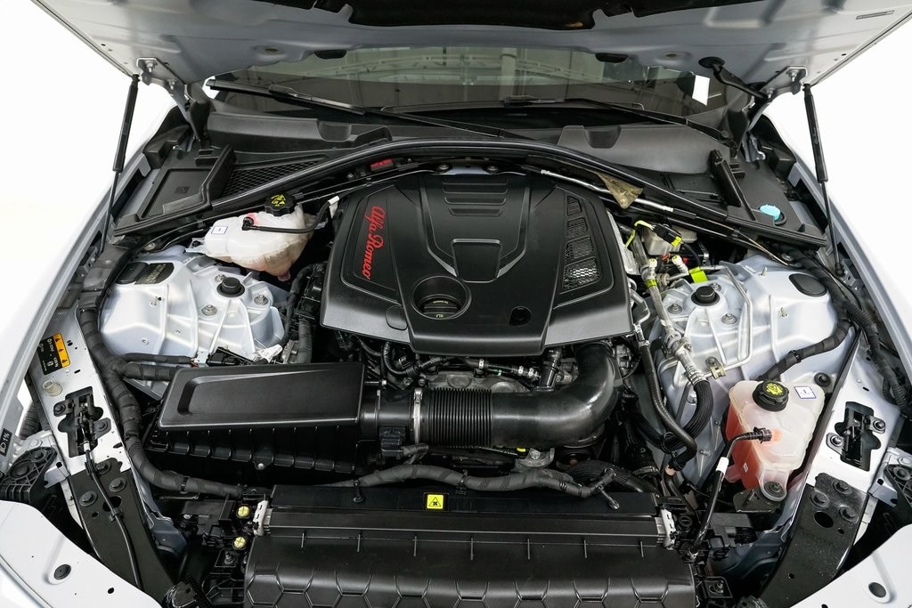 This Giulia is well equipped with Quick Order Package 22G (Silver Ti Badge), Apple CarPlay/Android Auto, Exterior Parking Camera Rear, Heated front seats, Heated rear seats, Heated steering wheel, High intensity discharge headlights: Bi-Xenon, Power moonroof, Radio: AM/FM/HD 8.8" w/Navigation, Wheels: 18" x 8.0" Dark Turbine Aluminum, 4-Wheel Disc Brakes, 8 Speakers, ABS brakes, Air Conditioning, Alloy wheels, AM/FM radio: SiriusXM, Auto High-beam Headlights, Auto-dimming door mirrors, Auto-dimming Rear-View mirror, Automatic temperature control, Brake assist, Bumpers: body-color, Compass, Delay-off headlights, Driver door bin, Driver vanity mirror, Dual front impact airbags, Dual front side impact airbags, Electronic Stability Control, Emergency communication system: SiriusXM Guardian - included trial, Four wheel independent suspension, Front anti-roll bar, Front Bucket Seats, Front Center Armrest, Front dual zone A/C, Front reading lights, Fully automatic headlights, Garage door transmitter, Genuine wood console insert, Genuine wood dashboard insert, Genuine wood door panel insert, Heated door mirrors, Illuminated entry, Knee airbag, Leather Seats, Leather Shift Knob, Leather steering wheel, Low tire pressure warning, Memory seat, Navigation System, Occupant sensing airbag, Outside temperature display, Overhead airbag, Overhead console, Panic alarm, Passenger door bin, Passenger vanity mirror, Power door mirrors, Power driver seat, Power passenger seat, Power steering, Power windows, Radio data system, Rain sensing wipers, Rear anti-roll bar, Rear fog lights, Rear reading lights, Rear seat center armrest, Rear window defroster, Remote keyless entry, Security system, Speed control, Speed-sensing steering, Speed-Sensitive Wipers, Split folding rear seat, Sport steering wheel, Steering wheel mounted audio controls, Tachometer, Telescoping steering wheel, Tilt steering wheel, Traction control, Trip computer, Turn signal indicator mirrors, and Variably intermittent wipers.