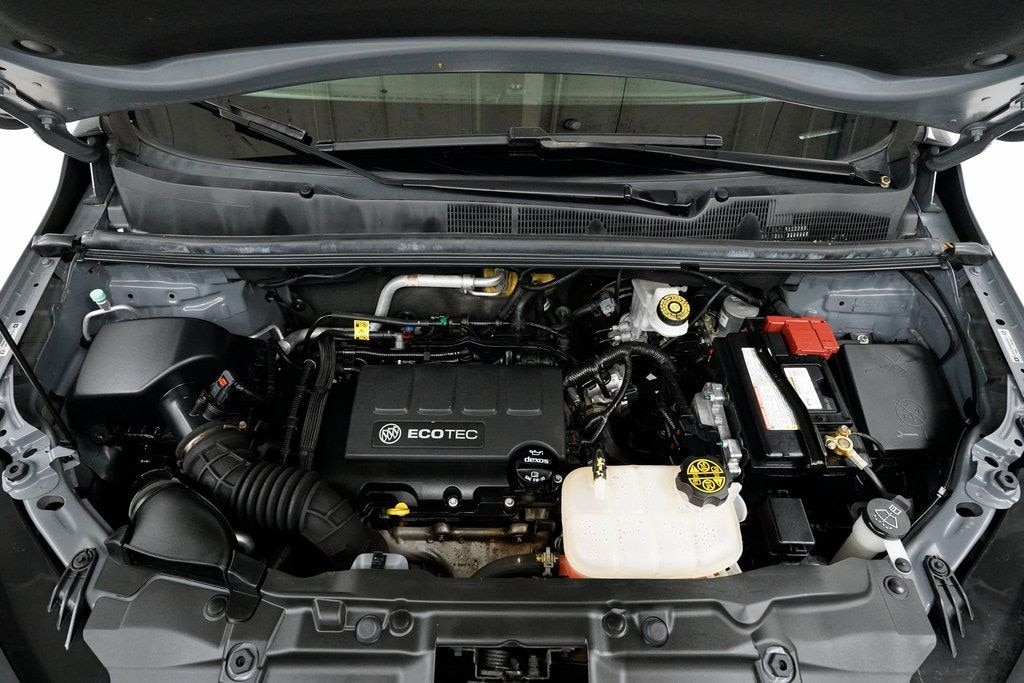 This Encore is well equipped with Preferred Equipment Group 1SB, Apple CarPlay/Android Auto, Exterior Parking Camera Rear, Radio: Buick Infotainment System AM/FM Stereo, Remote Vehicle Starter System, 2-Way Manual Front Passenger Seat Adjuster, 3.53 Final Drive Axle Ratio, 4-Wheel Disc Brakes, 6 Speakers, 6-Speaker Audio System, 6-Way Power Driver Seat Adjuster, ABS brakes, Air Conditioning, Alloy wheels, AM/FM radio: SiriusXM, Brake assist, Bumpers: body-color, Cloth w/Leatherette Seat Trim, Compass, Delay-off headlights, Driver door bin, Driver vanity mirror, Driver's Seat Mounted Armrest, Dual front impact airbags, Dual front side impact airbags, Electronic Stability Control, Emergency communication system: OnStar and Buick connected services capable, Front anti-roll bar, Front Bucket Seats, Front License Plate Bracket, Front reading lights, Front wheel independent suspension, Fully automatic headlights, Heated door mirrors, Illuminated entry, Knee airbag, Low tire pressure warning, Occupant sensing airbag, Outside temperature display, Overhead airbag, Panic alarm, Passenger door bin, Passenger vanity mirror, Power door mirrors, Power driver seat, Power steering, Power windows, Premium All-Weather Floor Liners (LPO), Radio data system, Rear seat center armrest, Rear side impact airbag, Rear window defroster, Rear window wiper, Remote keyless entry, Ride & Handling Suspension, Roof rack: rails only, Security system, SiriusXM Radio, Speed control, Speed-sensing steering, Split folding rear seat, Spoiler, Steering wheel mounted audio controls, Tachometer, Telescoping steering wheel, Tilt steering wheel, Traction control, Trip computer, Turn signal indicator mirrors, Variably intermittent wipers, and Wheels: 18" Machined-Face Alloy.
