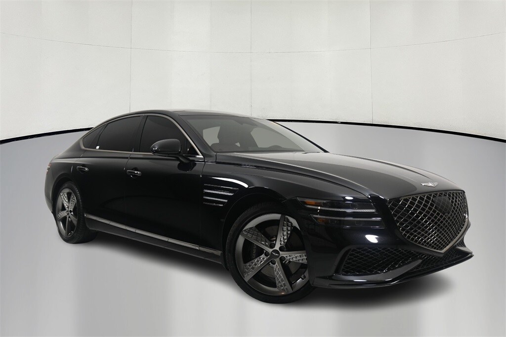 This G80 is well equipped with Sport Prestige Package (12.3" 3D Digital Instrument Cluster, 3-Zone Climate Control, Advanced Rear Occupant Alert, Blind-Spot View Monitor, Carbon Fiber Trim, Driver Ergo Motion Seat, Driver Seat Power Bolster & Cushion Extension, Electronically Controlled Suspension, Forward Attention Warning, Front Passenger Seat Walk-In Device, Genesis Digital Key, Head-Up Display, Microfiber Suede Headliner & Pillars, Nappa Leather Seating Surfaces, Power Rear Sunshades, Radio: AM/FM/HD/SiriusXM Lexicon Audio System, Rear Wheel Steering, Remote Smart Parking Assist, Reverse Parking Collision - Avoidance Assist, Surround View Monitor, Wheels: 20"x8.5J Fr & 20"x9.5J Rr Sport Alloy, and Wireless Phone Charger), 12 Speakers, 4-Wheel Disc Brakes, ABS brakes, Adaptive suspension, Air Conditioning, Alloy wheels, AM/FM radio: SiriusXM, Android Auto & Apple CarPlay, Anti-whiplash front head restraints, Auto High-beam Headlights, Auto tilt-away steering wheel, Auto-dimming door mirrors, Auto-dimming Rear-View mirror, Automatic temperature control, Bumpers: body-color, Compass, Delay-off headlights, Driver door bin, Driver vanity mirror, Dual front impact airbags, Dual front side impact airbags, Electronic Stability Control, Emergency communication system: Genesis Connected Services, Exterior Parking Camera Rear, First Aid Kit, Four wheel independent suspension, Front anti-roll bar, Front Bucket Seats, Front Center Armrest, Front dual zone A/C, Front reading lights, Fully automatic headlights, Garage door transmitter: HomeLink, Heated & Ventilated Front Bucket Seats, Heated door mirrors, Heated front seats, Heated rear seats, Heated steering wheel, Illuminated entry, Knee airbag, Leather Seating Surfaces, Leather steering wheel, Low tire pressure warning, Memory seat, Mudguards, Navigation System, Occupant sensing airbag, Outside temperature display, Overhead airbag, Overhead console, Panic alarm, Passenger door bin, Passenger vanity mirror, Power door mirrors, Power driver seat, Power moonroof, Power passenger seat, Power steering, Power windows, Radio data system, Radio: AM/FM/HD/SiriusXM Audio System, Rain sensing wipers, Rear anti-roll bar, Rear Bumper Applique, Rear reading lights, Rear seat center armrest, Rear side impact airbag, Rear window defroster, Remote keyless entry, Reversible Cargo Tray, Security system, Speed control, Speed-sensing steering, Speed-Sensitive Wipers, Steering wheel memory, Steering wheel mounted audio controls, Tachometer, Telescoping steering wheel, Tilt steering wheel, Traction control, Trip computer, Turn signal indicator mirrors, Variably intermittent wipers, Ventilated front seats, Wheel Locks, and Wheels: 19"x8.5J Fr & 19"x9.5J Rr Sport Alloy.